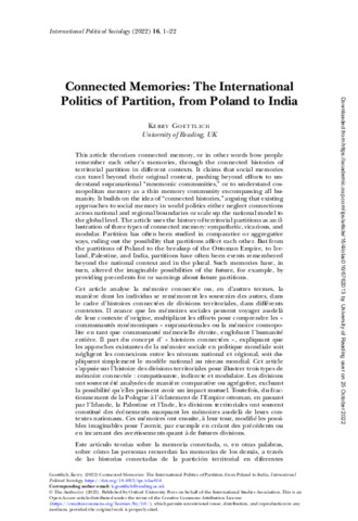 This article theorizes connected memory, or in other words how people remember each other's memories, through the connected histories of territorial partition in different contexts. It claims that social memories can travel beyond their original context, pushing beyond efforts to understand supranational “mnemonic communities,” or to understand cosmopolitan memory as a thin memory community encompassing all humanity. It builds on the idea of “connected histories,” arguing that existing approaches to social memory in world politics either neglect connections across national and regional boundaries or scale up the national model to the global level. The article uses the history of territorial partitions as an illustration of three types of connected memory: sympathetic, vicarious, and modular. Partition has often been studied in comparative or aggregative ways, ruling out the possibility that partitions affect each other. But from the partitions of Poland to the breakup of the Ottoman Empire, to Ireland, Palestine, and India, partitions have often been events remembered beyond the national context and in the plural. Such memories have, in turn, altered the imaginable possibilities of the future, for example, by providing precedents for or warnings about future partitions.