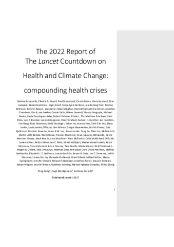 ORCID: https://orcid.org/0000-0003-2691-4436, Ayeb-Karlsson, S., Ford, L. B., Belesova, K., Bowen, K., Cai, W., Callaghan, M., Campbell-Lendrum, D., Chambers, J., van Daalen, K. R., Dalin, C., Dasandi, N., Dasgupta, S., Davies, M., Dominguez-Salas, P., Dubrow, R., Ebi, K. L., Eckelman, M., Ekins, P., Escobar, L. E., Georgeson, L., Graham, H., Gunther, S. H., Hamilton, I., Hang, Y., Hänninen, R., Hartinger, S., He, K., Hess, J. J., Hsu, S.-C., Jankin, S., Jamart, L., Jay, O., Kelman, I., Kiesewetter, G., Kinney, P., Kjellstrom, T., Kniveton, D., Lee, J. K. W., Lemke, B., Liu, Y., Liu, Z., Lott, M., Batista, M. L., Lowe, R., MacGuire, F., Sewe, M. O., Martinez-Urtaza, J., Maslin, M., McAllister, L., McGushin, A., McMichael, C., Mi, Z., Milner, J., Minor, K., Minx, J. C., Mohajeri, N., Moradi-Lakeh, M., Morrissey, K., Munzert, S., Murray, K. A., Neville, T., Nilsson, M., Obradovich, N., O'Hare, M. B., Oreszczyn, T., Otto, M., Owfi, F., Pearman, O., Rabbaniha, M., Robinson, E. J. Z., Rocklöv, J., Salas, R. N., Semenza, J. C., Sherman, J. D., Shi, L., Shumake-Guillemot, J., Silbert, G., Sofiev, M., Springmann, M., Stowell, J., Tabatabaei, M., Taylor, J., Triñanes, J., Wagner, F., Wilkinson, P., Winning, M., Yglesias-González, M., Zhang, S., Gong, P., Montgomery, H. and Costello, A.