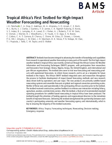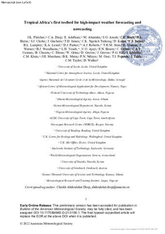 Fletcher, J. K., Diop, C. A., Adefisan, E., Ahiataku, M. A., Ansah, S. O., Birch, C. E., Burns, H. L., Clarke, S. J., Gacheru, J., James, T. D., Ngetich Tuikong, C. K., Koros, D., Indasi, V. S., Lamptey, B. L., Lawal, K. A., Parker, D. J., Roberts, A. J., Stein, T. H. M. ORCID: https://orcid.org/0000-0002-9215-5397, Visman, E., Warner, J., Woodhams, B. J., Youds, L. H., Ajayi, V. O., Bosire, E. N., Cafaro, C.