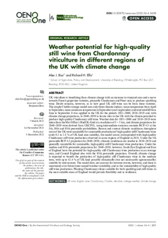 • Biss, A., & Ellis, R. (2021). Modelling Chablis vintage quality in response to inter-annual variation in weather. OENO One, 55(3), 209–228. https://doi.org/10.20870/oeno-one.2021.55.3.4709