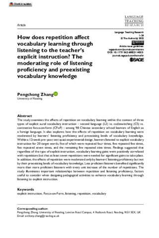 Zhang, P. orcid id iconORCID: https://orcid.org/0000-0002-2136-4984 (2022) How does repetition affect vocabulary learning through listening to the teacher’s explicit instruction? The moderating role of listening proficiency and preexisting vocabulary knowledge. Language Teaching Research. ISSN 1477-0954 doi: 10.1177/13621688221140521