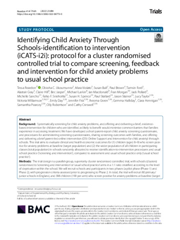 Identifying child anxiety through schools-identification to intervention (iCATS-i2i): protocol for a cluster randomised controlled trial to compare screening, feedback and intervention for child anxiety problems to usual school practice.
