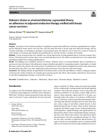 Alomeir, O., Patel, N. orcid id iconORCID: https://orcid.org/0000-0002-8600-0663 and Donyai, P. orcid id iconORCID: https://orcid.org/0000-0001-5403-6170 (2022) Hobson’s choice or a horned dilemma: a grounded theory on adherence to adjuvant endocrine therapy verified with breast cancer survivors. Supportive Care in Cancer, 30 (12). pp. 10127-10136. ISSN 0941-4355 doi: 10.1007/s00520-022-07435-2