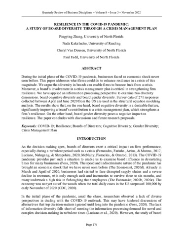 This paper addresses what boards of directors could do to enhance resilience in a crisis. We argue that board diversity could be important for firms to handle a crisis. Meanwhile, a board’s involvement in a crisis management plan could be critical in utilizing diversity to bounce back. We have applied an information processing perspective to investigate how board cognitive diversity and board gender diversity impact on board involvement in the crisis management plan. Survey data of 271 responses collected between April and June 2020 from the US are used in the structural equation modeling analysis. The results show that, on the one hand, board cognitive diversity is a desirable feature, significantly improving a board’s contribution to a crisis management plan, which strengthens a firm’s resilience. On the other hand, board gender diversity poses a negative impact on resilience. The paper concludes with discussions and future research proposals.