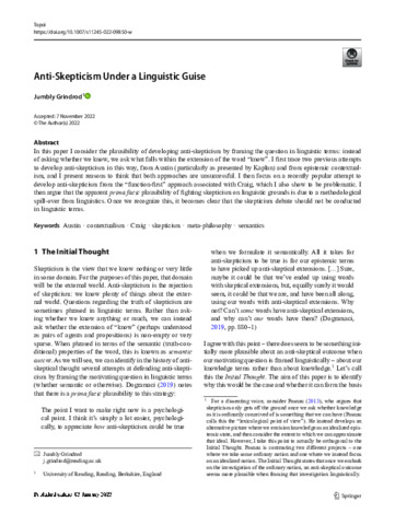 Grindrod, J. orcid id iconORCID: https://orcid.org/0000-0001-8684-974X (2023) Anti-skepticism under a linguistic guise. Topoi, 42. pp. 163-174. ISSN 1572-8749 doi: 10.1007/s11245-022-09850-w