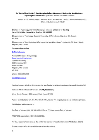 Adams, G. R. orcid id iconORCID: https://orcid.org/0000-0003-2849-6303, Gandhi, W. orcid id iconORCID: https://orcid.org/0000-0003-3796-6311, Harrison, R. orcid id iconORCID: https://orcid.org/0000-0003-3674-9622, Van Reekum, C. M. orcid id iconORCID: https://orcid.org/0000-0002-1516-1101, Wood-Anderson, D., Gilron, I. and Salomons, T. V. (2023) Do “central sensitisation” questionnaires reflect measures of nociceptive sensitisation or psychological constructs? A systematic review and meta-analyses. Pain, 164 (6). pp. 1222-1239. ISSN 1872-6623 doi: 10.1097/j.pain.0000000000002830