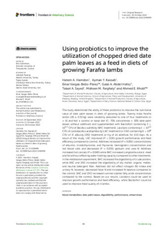 Using probiotics to improve the utilization of chopped dried date palm leaves as a feed in diets of growing Farafra lambs.