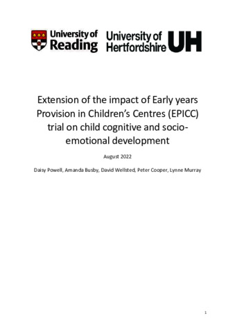 Powell, D. orcid id iconORCID: https://orcid.org/0000-0002-3607-2407, Busby, A., Wellsted, D., Cooper, P. and Murray, L., (2022) Report: Extension of the impact of Early years Provision in Children’s Centres (EPICC) trial on child cognitive and socio-emotional development. Report. Nuffield Foundation
