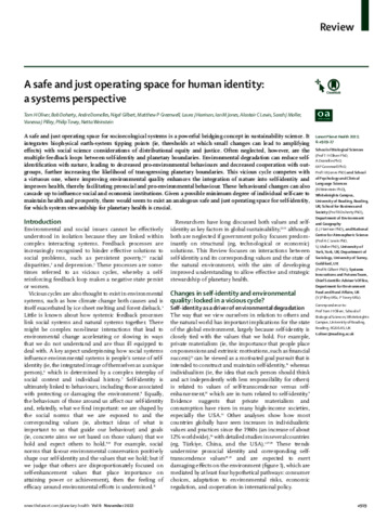 A safe and just operating space for socioecological systems is a powerful bridging concept in sustainability science. It integrates biophysical earth-system tipping points (ie, thresholds at which small changes can lead to amplifying effects) with social science considerations of distributional equity and justice. Often neglected, however, are the multiple feedback loops between self-identity and planetary boundaries. Environmental degradation can reduce self-identification with nature, leading to decreased pro-environmental behaviours and decreased cooperation with out-groups, further increasing the likelihood of transgressing planetary boundaries. This vicious cycle competes with a virtuous one, where improving environmental quality enhances the integration of nature into self-identity and improves health, thereby facilitating prosocial and pro-environmental behaviour. These behavioural changes can also cascade up to influence social and economic institutions. Given a possible minimum degree of individual self-care to maintain health and prosperity, there would seem to exist an analogous safe and just operating space for self-identity, for which system stewardship for planetary health is crucial.