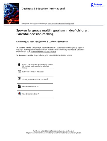 | Uncontrolled Keywords | Deafness; bilingualism; multilingualism; spoken language multilingualism; communication choice; family language policy; parental decision-making; professional guidanc |