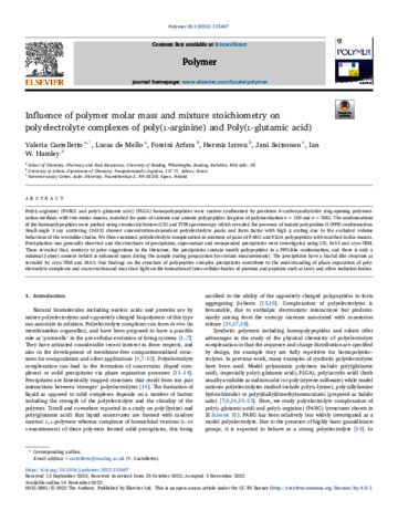 Influence of polymer molar mass and mixture stoichiometry on polyelectrolyte complexes of poly(l-arginine) and Poly(l-glutamic acid).