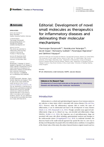 During any infection or injury, inflammation plays a vital role in curing the injured tissues. However, uncontrolled inflammatory responses due to defects in pro-resolution and anti-inflammatory processes can be detrimental and lead to many diseases, including gastrointestinal, liver, lung and brain disorders. Although many approved anti-inflammatory drugs are currently in clinical use, long-term usage of anti-inflammatory drugs is associated with many side effects, including gastrointestinal toxicity and adverse effects on the cardiovascular system. Hence, understanding and advancing in the field of small molecules is a better way to tackle this clinical problem with anti-inflammatory drugs. This special issue has collectively published research and review articles focusing on inflammation and small molecule therapeutics with a larger perspective to generate ideas for future scientific and clinical research. We are hopeful that the small molecule-based therapeutic approaches discussed here will evolve more into routine clinical practice in near future.