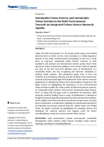 Today the built environment (or the human-made spaces and related infrastructures in which we live, work and play) is a vitally important element of our urban-oriented world. Increasingly we also see a closer focus on long-term ‘sustainable urban futures’ research, as both academics and national and international interest groups frame their discourses, policy and practice guidance, and current research agendas not only on the best and most effective ways of transitioning to a sustainable future, but also recognising the inherent complexity in existing ‘urban systems’. This perspective paper aims to trace the evolution of such thinking, drawing on both scholarly work and previous national and international high-level publications from relevant research programmes to identify key themes and commonalities of approach. The paper focuses on highlighting the importance of two interconnected research themes within the wider context of built environment research: (i) ‘sustainable urban systems’ (SUS) and (ii) ‘sustainable urban futures’ (SUF). In doing this the paper aims to synthesise the literature, distil emergent research findings from a range of publications to develop an integrated research agenda positioned at the nexus between these themes, and to explain what these and other key related concepts mean, and why they are important to understand. Adopting an international perspective and drawing on previous research from the ‘Global North’ and ‘Global South’, the paper concludes by highlighting the emerging lessons and challenges for research practice and suggests areas for future transdisciplinary research in what is termed ‘urban science’.