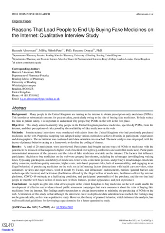 Background: Many people in the UK are turning to the internet to obtain their medicines. This introduces a significant public health risk and patient safety concerns as the Internet is a potential source of fake medicines. Objective: This qualitative study aimed to identify the reasons why people in the UK purchase medicines from the internet, which in turn could lead them to buy fake medicines inadvertently. The focus was on prescription only medicines (POMs) and those medicines that have the potential to be misused or that require a higher level of medical oversight during the purchase. This study also explored UK consumers’ perception of the risks posed by fake medicines available online. Methods: Semi-structured interviews were conducted with adults based in the UK who had previously purchased medicines online. The recruitment was continued until no new themes were identified (data saturation was reached). The Theory of Planned Behaviour (TPB) was employed to interpret their views, and interview transcripts analysed using thematic analysis. The University’s research ethics committee approval was obtained. Results: Twenty interviews were conducted. Participants had bought various types of POMs or medicines with potential to be misused or that required a higher level of medical oversight (e.g., HRT, antibiotics, and high-risk controlled medicines). Participants demonstrated awareness of the presence of fake medicines on the internet, and they understood risks associated with them. The factors that influence consumers decision to buy medicines online were identified and grouped into themes including advantages and disadvantages of purchasing medicines in this way, the social influencing factors, the barriers and facilitators of the purchase as well as factors that lead consumers to trust the online sellers of medicines. Conclusions: This study provides deep insight into the breadth of reasons that drive consumers to buy medicines online. Identifying these reasons could enable the development of effective public awareness campaigns that warn consumers about the risks of buying fake medicines from online source. The findings could also help researchers to design interventions to prevent people from buying POMs online in general, thus preventing the purchasing of fake medicines.