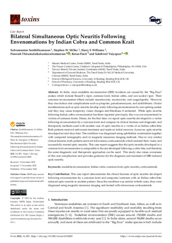 Senthilkumaran, S., Miller, S. W., Williams, H. F., Thirumalaikolundusubramanian, P., Patel, K. and Vaiyapuri, S. orcid id iconORCID: https://orcid.org/0000-0002-6006-6517 (2022) Bilateral simultaneous optic neuritis following envenomations by Indian cobra and common krait. Toxins, 14 (11). 805. ISSN 2072-6651 doi: 10.3390/toxins14110805