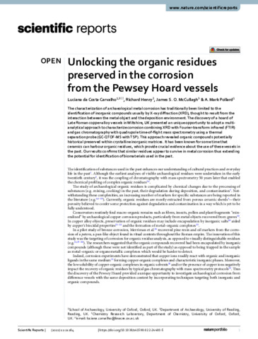 Carvalho, L. d. C., Henry, R., McCullagh, J. S. O. and Pollard, A. M. (2022) Unlocking the organic residues preserved in the corrosion from the Pewsey Hoard vessels. Scientific Reports, 12. 21284. ISSN 2045-2322 doi: 10.1038/s41598-022-24400-5