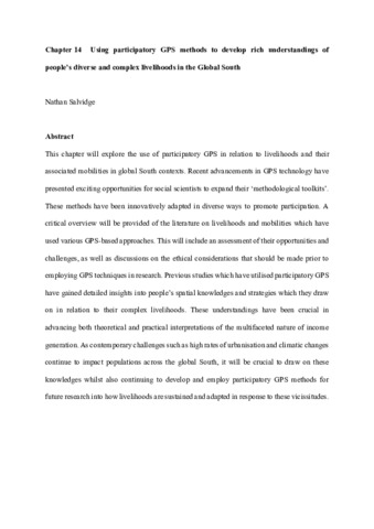 Salvidge, N. orcid id iconORCID: https://orcid.org/0000-0002-9716-5156 (2023) Using participatory GPS methods to develop rich understandings of people’s diverse and complex livelihoods in the global south. In: Nunan, F., Barnes, C. and Krishnamirthy, S. (eds.) The Routledge Handbook on Livelihoods in the Global South. Routledge, pp. 147-156. ISBN 9780367856359