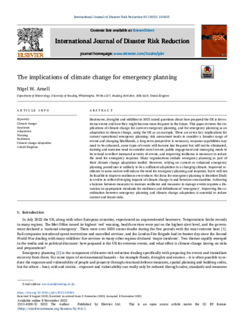 Heatwaves, droughts and wildfires in 2022 raised questions about how prepared the UK is for extreme events and how they might become more frequent in the future. This paper reviews the implications of climate change for current emergency planning, and for emergency planning as an adaptation to climate change, using the UK as an example. There are seven key implications for current emergency planning: risk assessment needs to consider a broader range of events and changing likelihoods, a long-term perspective is necessary, response capabilities may need to be enhanced, some types of events will become less frequent but will not be eliminated, training and exercises need to consider novel events, public messaging needs to be revised to reflect increased severity of events, and improving resilience is necessary to reduce the need for emergency response. Many organisations include emergency planning as part of their climate change adaptation toolkit. However, relying on emergency planning procedures is unlikely to be a sufficient adaptation to a changing climate. Improved resilience in some sectors will reduce the need for emergency planning and response, but it will not be feasible to improve resilience everywhere: the focus for emergency planning will therefore evolve to reflect diverging impacts of climate change in and between communities. Achieving a balance between measures to increase resilience and measures to manage events requires a discussion on standards for resilience and definitions of ‘emergency’. Improving the coordination between emergency planning and climate change adaptation is essential to reduce current and future risks.
