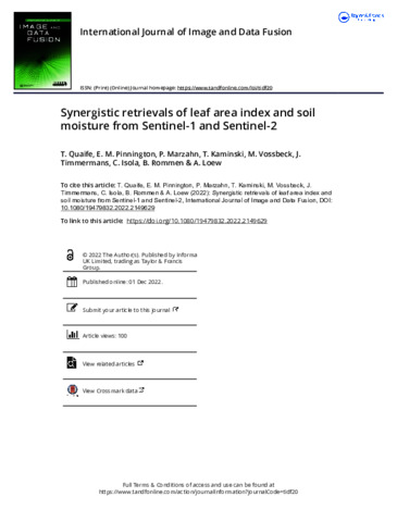 Quaife, T. orcid id iconORCID: https://orcid.org/0000-0001-6896-4613, Pinnington, E. M., Marzhan, P., Kaminski, T., Vossbeck, M., Timmermans, J., Isola, C., Rommen, B. and Loew, A. (2023) Synergistic retrievals of leaf area index and soil moisture from Sentinel-1 and Sentinel-2. International Journal of Image and Data Fusion, 14 (3). pp. 225-242. ISSN 1947-9824 doi: 10.1080/19479832.2022.2149629