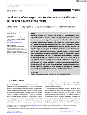Davis, D., Vajaria, R., Delivopoulos, E. orcid id iconORCID: https://orcid.org/0000-0001-6156-1133 and Vasudevan, N. orcid id iconORCID: https://orcid.org/0000-0003-4326-3938 (2023) Localisation of oestrogen receptors in stem cells and in stem cell derived neurons of the mouse. Journal of Neuroendocrinology, 35 (2). e13220. ISSN 0953-8194 doi: 10.1111/jne.13220