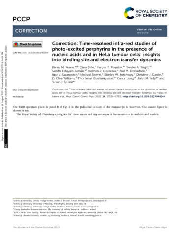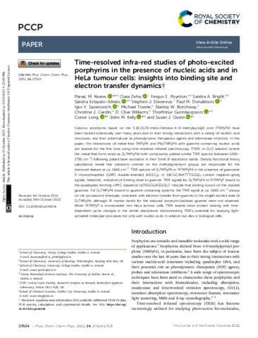 Time-resolved infra-red studies of photo-excited porphyrins in the presence of nucleic acids and in HeLa tumour cells: insights into binding site and electron transfer dynamics.