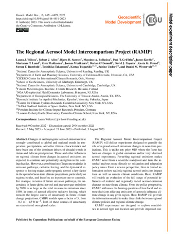 Wilcox, L. J. orcid id iconORCID: https://orcid.org/0000-0001-5691-1493, Allen, R. J., Samset, B. H., Bollasina, M. A., Griffiths, P. T., Keeble, J. M., Lund, M. T., Makkonen, R., Merikanto, J., O'Donnell, D., Paynter, D. J., Persad, G. G., Rumbold, S. T. orcid id iconORCID: https://orcid.org/0000-0001-8138-4541, Takemura, T., Tsigaridis, K., Undorf, S. and Westervelt, D. M. (2023) The regional aerosol model intercomparison project (RAMIP). Geoscientific Model Development, 16 (15). pp. 4451-4479. ISSN 1991-9603 doi: 10.5194/gmd-16-4451-2023