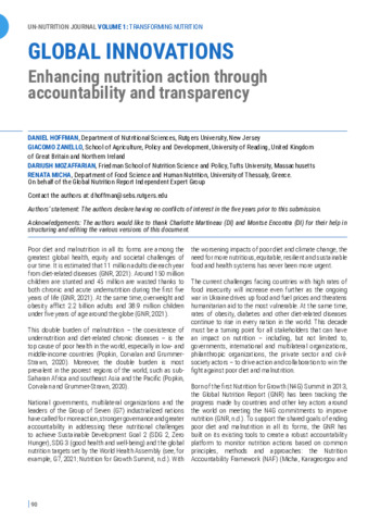 Hoffman, D., Zanello, G. orcid id iconORCID: https://orcid.org/0000-0002-0477-1385, Mozaffarian, D. and Micha, R. (2022) Enhancing nutrition action through accountability and transparency. Un-Nutrition Journal, 1. pp. 90-93. (ISBN 9789251371510)