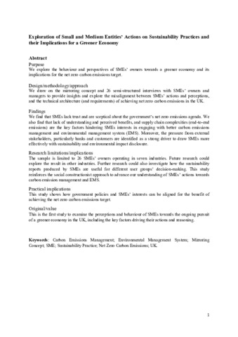 Purpose We explore the behaviour and perspectives of SMEs’ owners towards a greener economy and its implications for the net zero carbon emissions target. Design/methodology/approach We draw on the mirroring concept and 26 semi-structured interviews with SMEs’ owners and managers to provide insights and explore the misalignment between SMEs’ actions and perceptions, and the technical architecture (and requirements) of achieving net zero carbon emissions in the UK. Findings We find that SMEs lack trust and are sceptical about the government’s net zero emissions agenda. We also find that lack of understanding and perceived benefits, and supply chain complexities (end-to-end emissions) are the key factors hindering SMEs interests in engaging with better carbon emissions management and environmental management system (EMS). Moreover, the pressure from external stakeholders, particularly banks and customers are identified as a strong driver to draw SMEs more effectively with sustainability and environmental impact disclosure. Research limitations/implications The sample is limited to 26 SMEs’ owners operating in seven industries. Future research could explore the result in other industries. Further research could also investigate how the sustainability reports produced by SMEs are useful for different user groups’ decision-making. This study reinforces the social constructionist approach to advance our understanding of SMEs’ actions towards carbon emission management and EMS. Practical implications This study shows how government policies and SMEs’ interests can be aligned for the benefit of achieving the net zero carbon emissions target. Original/value This is the first study to examine the perceptions and behaviour of SMEs towards the ongoing pursuit of a greener economy in the UK, including the key factors driving their actions and reasoning.