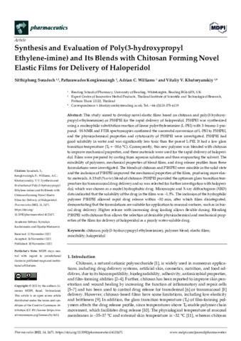Soradech, S., Kengkwasingh, P., Williams, A. C. orcid id iconORCID: https://orcid.org/0000-0003-3654-7916 and Khutoryanskiy, V. V. orcid id iconORCID: https://orcid.org/0000-0002-7221-2630 (2022) Synthesis and evaluation of poly(3-hydroxypropyl ethylene-imine) and its blends with chitosan forming novel elastic films for delivery of haloperidol. Pharmaceutics, 14 (12). 2671. ISSN 1999-4923 doi: 10.3390/pharmaceutics14122671