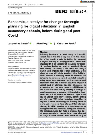 Baxter, J., Floyd, A. orcid id iconORCID: https://orcid.org/0000-0002-2008-7831 and Jewitt, K. (2023) Pandemic, a catalyst for change: strategic planning for digital education in English secondary schools, before during and post covid. British Educational Research Journal, 49 (2). pp. 329-351. ISSN 1469-3518 doi: 10.1002/berj.3845