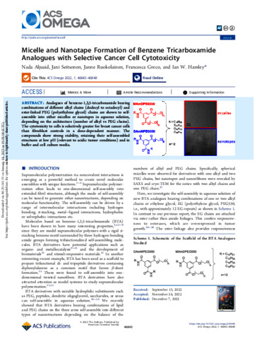 Analogues of benzene-1,3,5-tricarboxamide bearing combinations of different alkyl chains (dodecyl to octadecyl) and ester-linked PEG (polyethylene glycol) chains are shown to self-assemble into either micelles or nanotapes in aqueous solution, depending on the architecture (number of alkyl vs PEG chains). The cytotoxicity to cells is selectively greater for breast cancer cells than fibroblast controls in a dose-dependent manner. The compounds show strong stability, retaining their self-assembled structures at low pH (relevant to acidic tumor conditions) and in buffer and cell culture media.