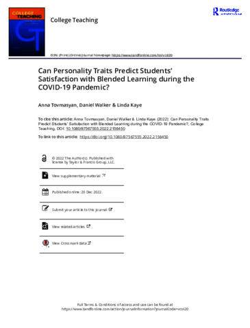 • Audet, É. C., Levine, S. L., Metin, E., Koestner, S., & Barcan, S. (2021). Zooming their way through university: Which Big 5 traits facilitated students' adjustment to online courses during the COVID-19 pandemic. Personality and Individual Differences, 180. https://doi.org/10.1016/j.paid.2021.110969