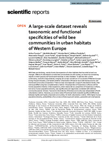 Fauviau, A., Baude, M., Bazin, N., Fiordaliso, W., Fisogni, A., Fortel, L., Garrigue, J., Geslin, B., Goulnik, J., Guilbaud, L., Hautekèete, N., Heiniger, C., Kuhlmann, M., Lambert, O., Langlois, D., Le Féon, V., Lopez Vaamonde, C., Maillet, G., Massol, F., Michel, N., Michelot-Antalik, A., Michez, D., Mouret, H., Piquot, Y., Potts, S. G. orcid id iconORCID: https://orcid.org/0000-0002-2045-980X, Roberts, S., Ropars, L., Schurr, L., Van Reeth, C., Villalta, I., Zaninotto, V. orcid id iconORCID: https://orcid.org/0000-0002-3397-398X, Dajoz, I. and Henry, M. (2022) A large-scale dataset reveals taxonomic and functional specificities of wild bee communities in urban habitats of Western Europe. Scientific Reports, 12 (1). 18866. ISSN 2045-2322 doi: 10.1038/s41598-022-21512-w