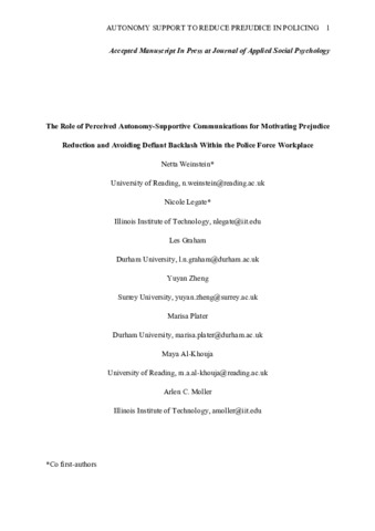 The role of perceived autonomy‐supportive communications for motivating prejudice reduction and avoiding defiant backlash within the police force workplace.
