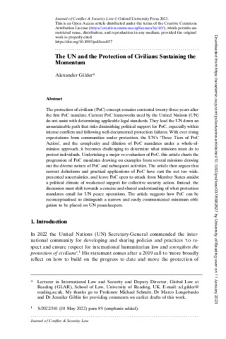 The protection of civilians (PoC) concept remains contested twenty-three years after the first PoC mandate. Current PoC frameworks used by the UN do not assist with determining applicable legal standards. They lead the UN down an unsustainable path that risks diminishing political support for PoC, especially within intense conflicts and following well-documented protection failures. With ever-rising expectations from communities under protection, the UN’s ‘Three Tiers of PoC Action’, and the complexity and dilution of PoC mandates under a whole-of-mission approach. It becomes challenging to determine what missions must do to protect individuals. To undertake a major re-evaluation of PoC, this article charts the progression of PoC mandates drawing on examples from several missions to highlight the diverse nature of PoC and subsequent activities. The article then argues that current definitions and practical applications of PoC have cast the net too wide, presented uncertainties, and leave PoC open to attack from member states amidst a political climate of weakened support for collective security action. Instead, the discussion must shift toward a concise and shared understanding of what protection mandates entail for UN peace operations. The article suggests how PoC can be reconceptualised to distinguish a narrow and easily communicated minimum obligation to be placed on UN peacekeepers.