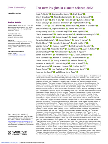 Non-technical summary We summarize what we assess as the past year's most important findings within climate change research: limits to adaptation, vulnerability hotspots, new threats coming from the climate–health nexus, climate (im)mobility and security, sustainable practices for land use and finance, losses and damages, inclusive societal climate decisions and ways to overcome structural barriers to accelerate mitigation and limit global warming to below 2°C. Technical summary We synthesize 10 topics within climate research where there have been significant advances or emerging scientific consensus since January 2021. The selection of these insights was based on input from an international open call with broad disciplinary scope. Findings concern: (1) new aspects of soft and hard limits to adaptation; (2) the emergence of regional vulnerability hotspots from climate impacts and human vulnerability; (3) new threats on the climate–health horizon – some involving plants and animals; (4) climate (im)mobility and the need for anticipatory action; (5) security and climate; (6) sustainable land management as a prerequisite to land-based solutions; (7) sustainable finance practices in the private sector and the need for political guidance; (8) the urgent planetary imperative for addressing losses and damages; (9) inclusive societal choices for climate-resilient development and (10) how to overcome barriers to accelerate mitigation and limit global warming to below 2°C. Social media summary Science has evidence on barriers to mitigation and how to overcome them to avoid limits to adaptation across multiple fields.