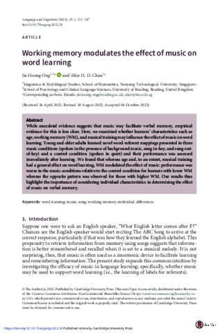 While anecdotal evidence suggests that music may facilitate verbal memory, empirical evidence for this is less clear. Here, we examined whether learners’ characteristics such as age, working memory (WM), and musical training may influence the effect of music on word learning. Young and older adults learned novel word-referent mappings presented in three music conditions (spoken in the presence of background music, sung in-key, and sung outof- key) and a control condition (spoken in quiet) and their performance was assessed immediately after learning. We found that whereas age and, to an extent, musical training had a general effect on word learning,WMmodulated the effect of music: performance was worse in the music conditions relative to the control condition for learners with lower WM whereas the opposite pattern was observed for those with higher WM. Our results thus highlight the importance of considering individual characteristics in determining the effect of music on verbal memory.