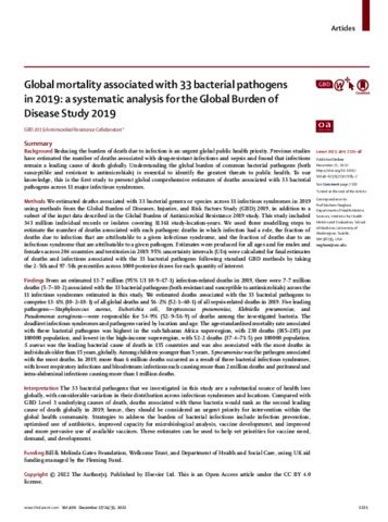 Global mortality associated with 33 bacterial pathogens in 2019: a systematic analysis for the Global Burden of Disease Study 2019.