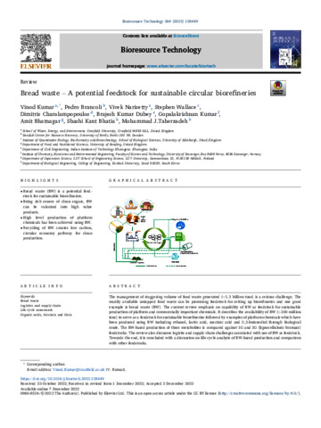 Kumar, V. orcid id iconORCID: https://orcid.org/0000-0001-8967-6119, Brancoli, P., Narisetty, V., Wallace, S., Charalampopoulos, D. orcid id iconORCID: https://orcid.org/0000-0003-1269-8402, Kumar Dubey, B., Kumar, G., Bhatnagar, A., Kant Bhatia, S. and J.Taherzadeh, M. (2023) Bread waste – a potential feedstock for sustainable circular biorefineries. Bioresource Technology, 369. 128449. ISSN 0960-8524 doi: 10.1016/j.biortech.2022.128449