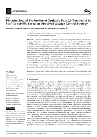 Suttikul, S., Charalampopoulos, D. orcid id iconORCID: https://orcid.org/0000-0003-1269-8402 and Chatzifragkou, A. orcid id iconORCID: https://orcid.org/0000-0002-9255-7871 (2023) Biotechnological production of optically pure 2,3-Butanediol by Bacillus subtilis based on Dissolved Oxygen Control Strategy. Fermentation, 9 (1). 15. ISSN 2311-5637 doi: 10.3390/fermentation9010015