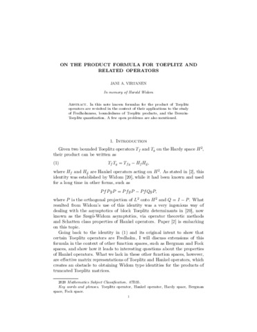 Virtanen, J. A. (2022) On the product formula for Toeplitz and related operators. In: Basor, E., Böttcher,, A., Ehrhardt,, T. and Tracy, C. A. (eds.) Toeplitz Operators and Random Matrices. Operator Theory: Advances and Applications, 289 (289). Birkhäuser, Cham., pp. 605-616. ISBN 9783031138508 doi: 10.1007/978-3-031-13851-5_26