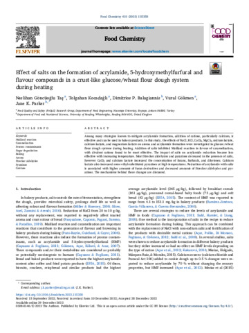 Göncüoğlu Taş, N., Kocadağlı, T., Balagiannis, D. P., Gökmen, V. and Parker, J. K. orcid id iconORCID: https://orcid.org/0000-0003-4121-5481 (2023) Effect of salts on the formation of acrylamide, 5-hydroxymethylfurfural and flavour compounds in a crust-like glucose/wheat flour dough system during heating. Food Chemistry, 410. 135358. ISSN 0308-8146 doi: 10.1016/j.foodchem.2022.135358