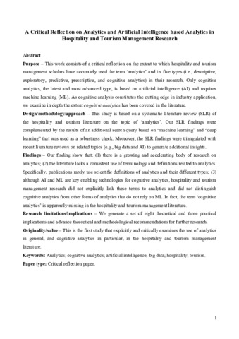 Purpose – This work consists of a critical reflection on the extent to which hospitality and tourism management scholars have accurately used the term ‘analytics’ and its five types (i.e., descriptive, exploratory, predictive, prescriptive, and cognitive analytics) in their research. Only cognitive analytics, the latest and most advanced type, is based on artificial intelligence (AI) and requires machine learning (ML). As cognitive analysis constitutes the cutting edge in industry application, we examine in depth the extent cognitive analytics has been covered in the literature. Design/methodology/approach – This study is based on a systematic literature review (SLR) of the hospitality and tourism literature on the topic of ‘analytics’. Our SLR findings were complemented by the results of an additional search query based on “machine learning” and “deep learning” that was used as a robustness check. Moreover, the SLR findings were triangulated with recent literature reviews on related topics (e.g., big data and AI) to generate additional insights. Findings – Our finding show that: (1) there is a growing and accelerating body of research on analytics; (2) the literature lacks a consistent use of terminology and definitions related to analytics. Specifically, publications rarely use scientific definitions of analytics and their different types; (3) although AI and ML are key enabling technologies for cognitive analytics, hospitality and tourism management research did not explicitly link these terms to analytics and did not distinguish cognitive analytics from other forms of analytics that do not rely on ML. In fact, the term ‘cognitive analytics’ is apparently missing in the hospitality and tourism management literature. Research limitations/implications – We generate a set of eight theoretical and three practical implications and advance theoretical and methodological recommendations for further research. Originality/value – This is the first study that explicitly and critically examines the use of analytics in general, and cognitive analytics in particular, in the hospitality and tourism management literature.