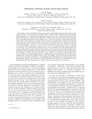 We consider a class of models describing an ensemble of identical interacting agents subject to multiplicative noise. In the thermodynamic limit, these systems exhibit continuous and discontinuous phase transitions in a, generally, nonequilibrium setting. We provide a systematic dimension reduction methodology for constructing low-dimensional, reduced-order dynamics based on the cumulants of the probability distribution of the infinite system. We show that the low-dimensional dynamics returns the correct diagnostic properties since it produces a quantitatively accurate representation of the stationary phase diagram of the system that we compare with exact analytical results and numerical simulations. Moreover, we prove that the reduced order dynamics yields also the prognostic, i.e., time-dependent properties, as it provides the correct response of the system to external perturbations. On the one hand, this validates the use of our complexity reduction methodology since it retains information not only of the invariant measure of the system but also of the transition probabilities and time-dependent correlation properties of the stochastic dynamics. On the other hand, the breakdown of linear response properties is a key signature of the occurence of a phase transition. We show that the reduced response operators capture the correct diverging resonant behavior by quantitatively assessing the singular nature of the susceptibility of the system and the appearance of a pole for real values of frequencies. Hence, this methodology can be interpreted as a low-dimensional, reduced order approach to the investigation and detection of critical phenomena in high-dimensional interacting systems in settings where order parameters are not known.