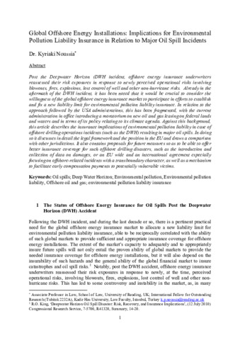 Global offshore energy installations: implications for environmental pollution liability insurance in relation to major oil spill incidents.