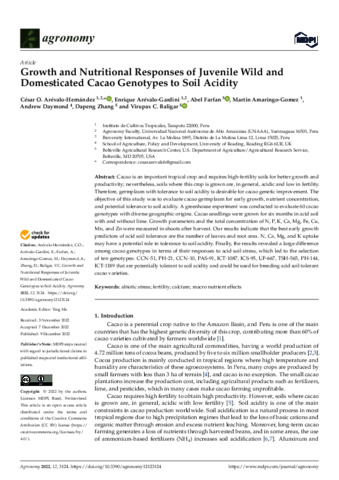 Arévalo-Hernández, C. O., Arévalo-Gardini, E., Farfan, A., Amaringo-Gomez, M., Daymond, A. orcid id iconORCID: https://orcid.org/0000-0002-7597-9423, Zhang, D. and Baligar, V. C. (2022) Growth and nutritional responses of juvenile wild and domesticated cacao genotypes to soil acidity. Agronomy, 12 (12). 3124. ISSN 2073-4395 doi: 10.3390/agronomy12123124