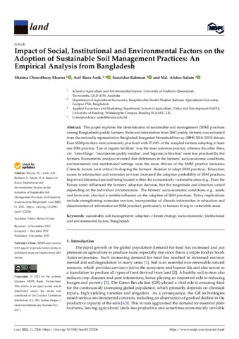 Sharna, S. C. orcid id iconORCID: https://orcid.org/0000-0002-2137-0030, Anik, A. R. orcid id iconORCID: https://orcid.org/0000-0002-0461-6094, Rahman, S. orcid id iconORCID: https://orcid.org/0000-0002-0391-6191 and Salam, M. A. orcid id iconORCID: https://orcid.org/0000-0002-6400-2940 (2022) Impact of social, institutional and environmental factors on the adoption of sustainable soil management practices: an empirical analysis from Bangladesh. Land, 11 (12). 2206. ISSN 2073-445X doi: 10.3390/land11122206