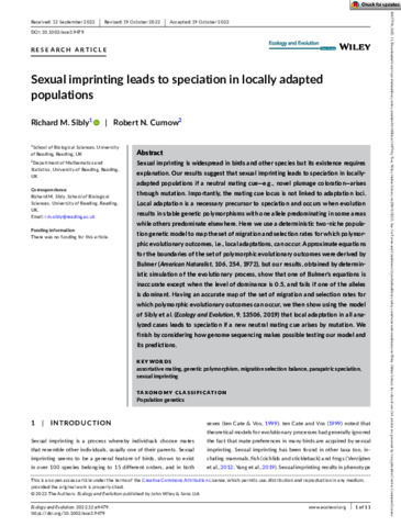 Sibly, R. M. orcid id iconORCID: https://orcid.org/0000-0001-6828-3543 and Curnow, R. N. (2022) Sexual imprinting leads to speciation in locally adapted populations. Ecology and Evolution, 12 (11). e9479. ISSN 2045-7758 doi: 10.1002/ece3.9479