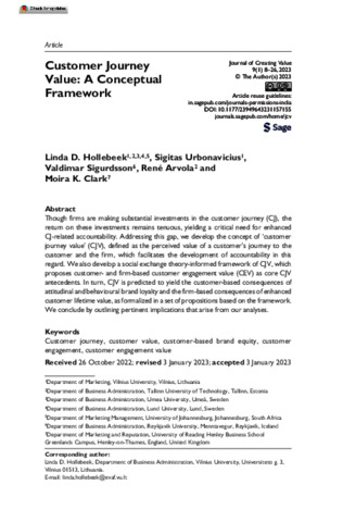 Hollebeek, L. D., Urbonavicius, S., Sigurdsson, V., Arvola, R. and Clark, M. K. (2023) Customer journey value: a conceptual framework. Journal of Creating Value, 9 (1). pp. 8-26. ISSN 2454-213X doi: 10.1177/23949643231157155