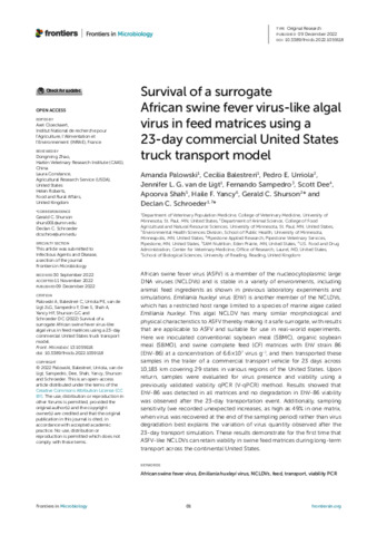 Palowski, A., Balestreri, C., Urriola, P. E., van de Ligt, J. L. G., Sampedro, F., Dee, S., Shah, A., Yancy, H. F., Shurson, G. C. and Schroeder, D. C. (2022) Survival of a surrogate African swine fever virus-like algal virus in feed matrices using a 23-day commercial United States truck transport model. Frontiers in Microbiology, 13. 1059118. ISSN 1664-302X doi: 10.3389/fmicb.2022.1059118
